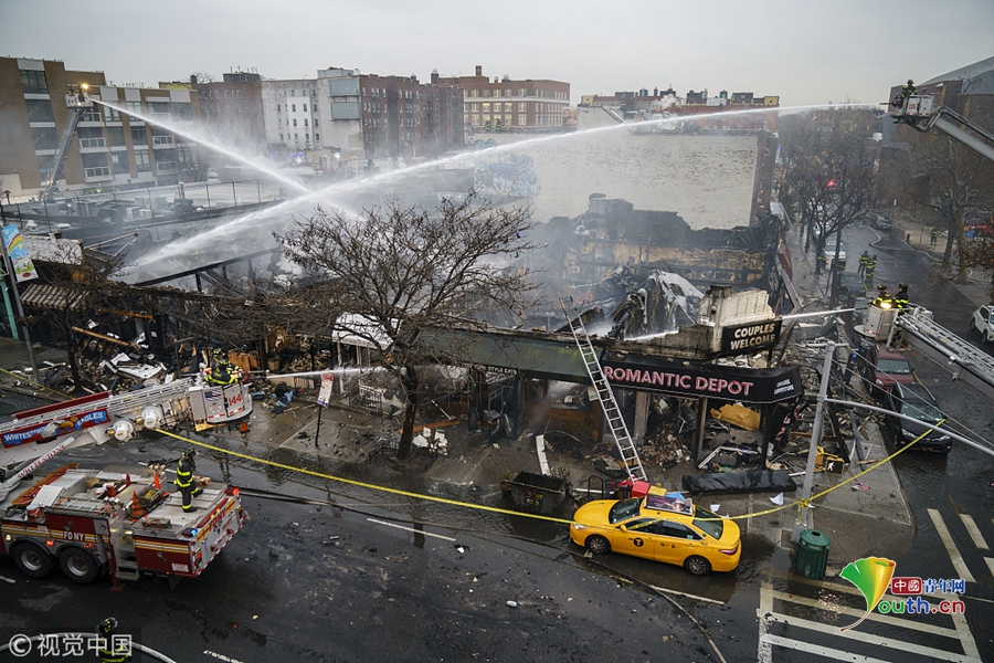 當?shù)貢r間2018年12月13日,美國紐約,在紐約皇后區(qū)皇后大道,一場大火吞噬了六家商鋪,消防隊員正在努力撲滅火災余燼。十幾人受傷,包括6名消防員。起火原因仍在調查中。圖片作者:Drew Angerer