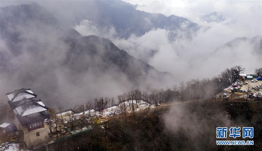 11月17日無人機拍攝的華山蒼龍嶺。 當日凌晨的一場大雪將西岳華山變成白雪皚皚的世界,白雪與蒼翠的華山奇松、靈動的云海交相輝映,如夢如幻;滿山遍野玉樹瓊花,樹枝上通體的霧凇晶瑩剔透,繪就冬日畫境,美不勝收,游人如置身人間仙境。 新華社記者陶明攝