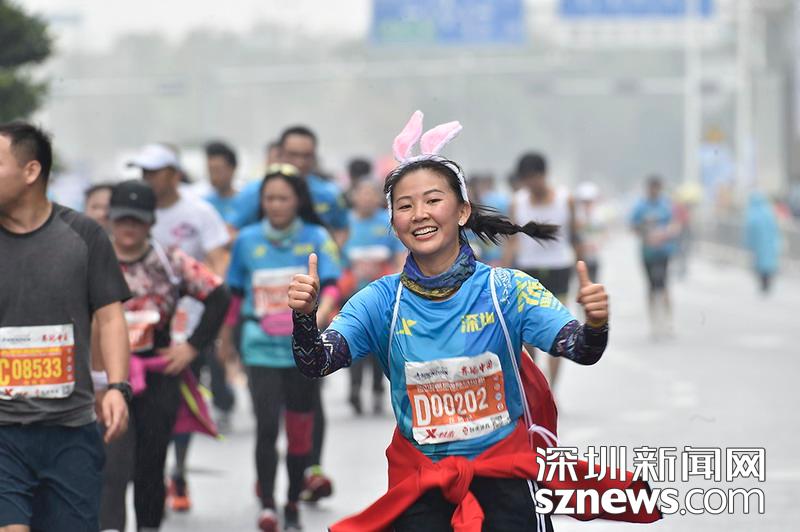 2018年12月16日,深圳國際馬拉松位于后海的折返點(diǎn),即將抵達(dá)終點(diǎn),選手對著鏡頭豎起大拇指。