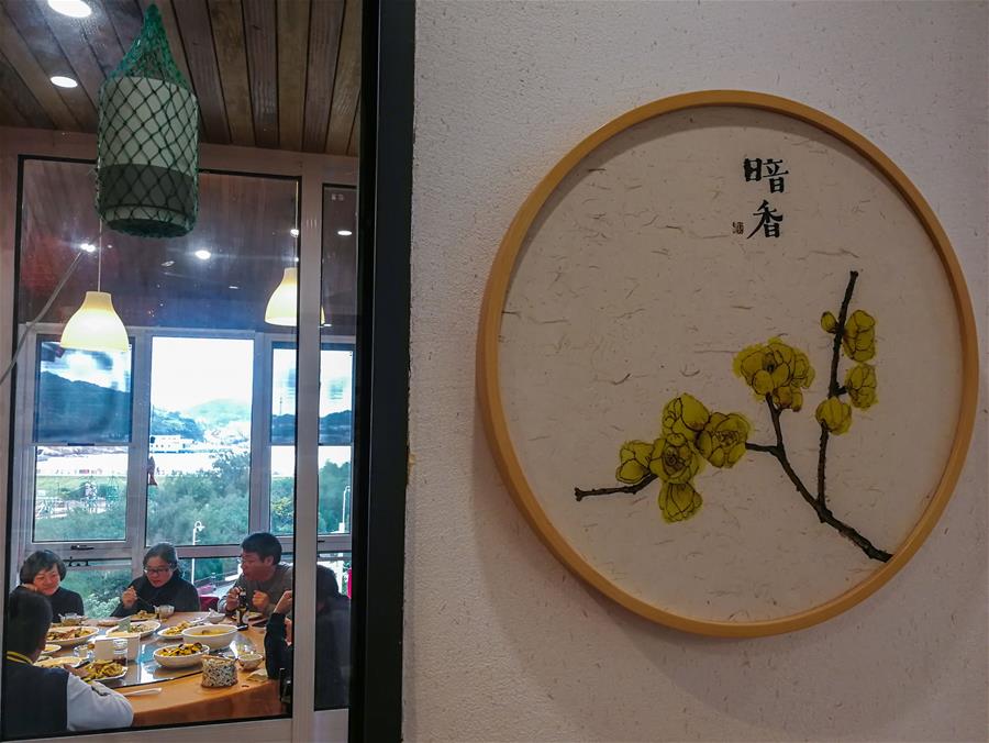 12月15日,客人在朱家尖烏石塘“漁夫客棧”民宿包廂內用餐,該民宿有海景房7間,餐飲包廂8個。 新華社記者 徐昱 攝
