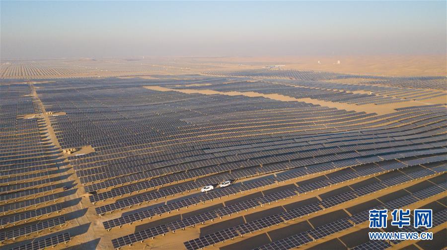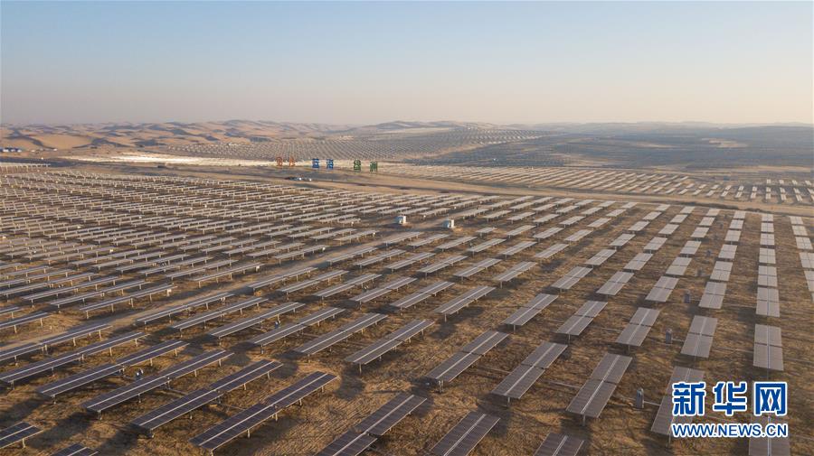 位于庫布其沙漠腹地的達拉特光伏發(fā)電應(yīng)用領(lǐng)跑基地一期500兆瓦項目(12月13日攝)。
