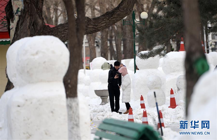12月17日,游客在松花江畔雪人雕塑區(qū)拍照后查看照片。新華社記者王凱攝