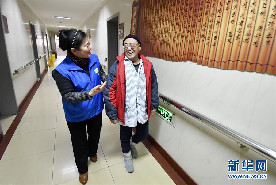 12月17日,豐臺區(qū)長辛店街道車輛廠社區(qū)養(yǎng)老服務(wù)驛站的員工陪同她們通過“連心通”救助的突發(fā)疾病獨居老人連鐵良(右)做康復(fù)。 新華社記者 李欣 攝