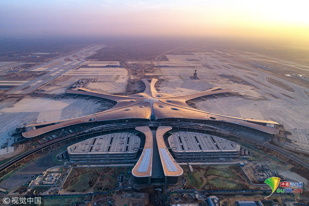 中國青年網北京12月20日電 2018年12月19日,北京大興國際機場航站樓的屋面已基本完工,一只金色“鳳凰”完整地出現(xiàn)在北京城南。航站樓的室內裝修在有條不紊的推進中。