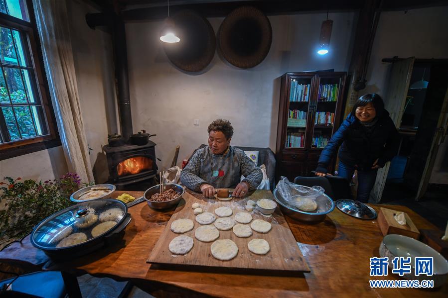 12月19日,民宿“僻地寒樓”的主人張雁(右)和媽媽在制作特色美食。該民宿共有7幢風(fēng)格各異的小屋分布在山坡上,頗具特色。河橋鎮(zhèn)青年張雁辭去了上海的工作,回到家鄉(xiāng)開(kāi)辦了這家民宿。 新華社記者 徐昱 攝