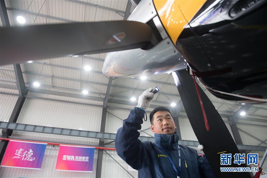 12月20日,在建德市航空小鎮(zhèn),工作人員對一架大棕熊100系列飛機進行日常維護。 當日,浙江省建德市航空小鎮(zhèn)通航制造板塊首架飛機下線交付。此次下線交付的大棕熊100系列Ⅱ飛機由美國Quest飛機制造公司出品,有望在通用航空領域發(fā)揮作用。建德市自2016年開始航空小鎮(zhèn)創(chuàng)建,2017年被列入全國第二批特色小鎮(zhèn)名單。 新華社記者翁忻旸攝