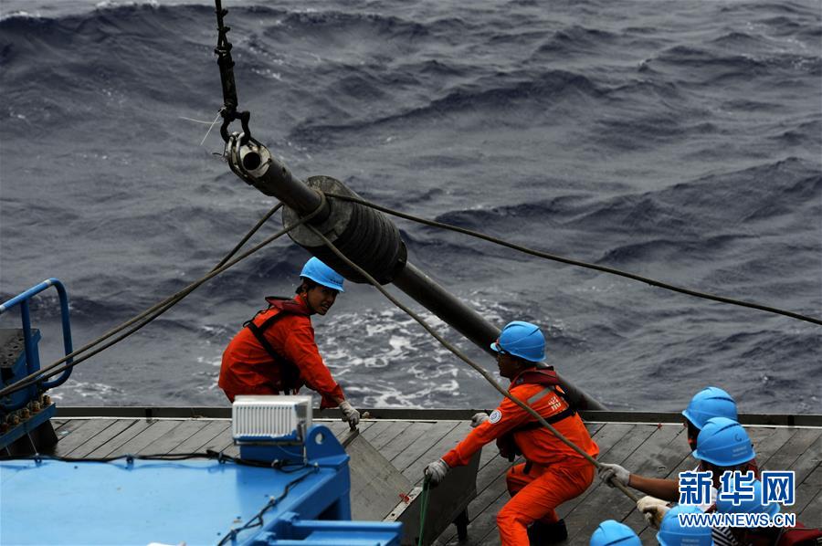 科考團隊成員在船上布放重力柱(12月21日攝)。