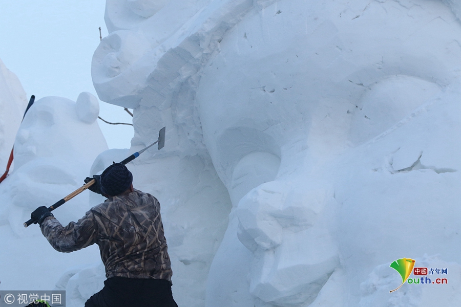 國內(nèi)最大的雪雕盛會太陽島雪博會正在緊鑼密鼓建設(shè)中,部分雪雕雛形已現(xiàn),雪雕師正在精雕細(xì)刻打磨中。