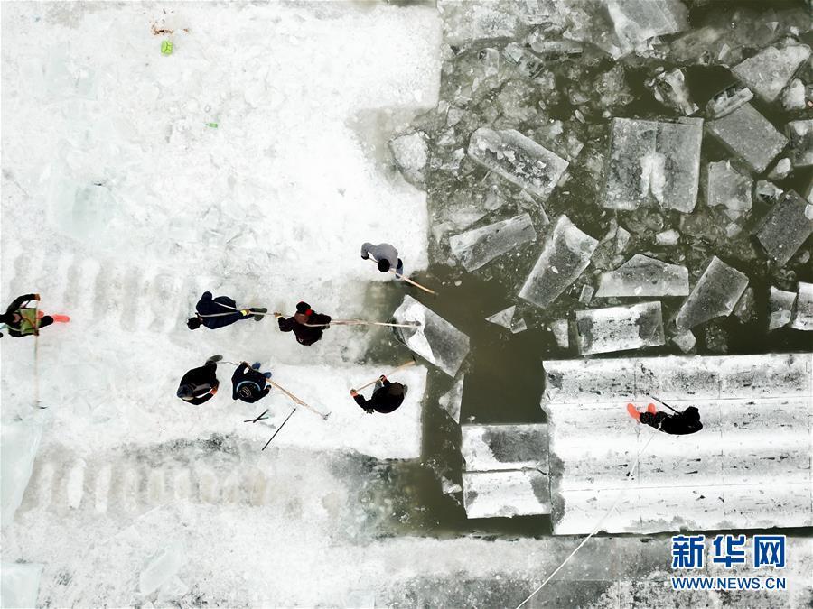 在松花江哈爾濱段江面,工人們在進(jìn)行切割和采冰工作(12月12日無人機拍攝)。 黑龍江哈爾濱市的冰雪主題樂園哈爾濱冰雪大世界的采冰和建設(shè)工作近日拉開帷幕。為保證足夠的優(yōu)質(zhì)冰供給,每天有近千名采冰人和700多輛運冰車參與到采冰工作。 新華社記者 王松 攝