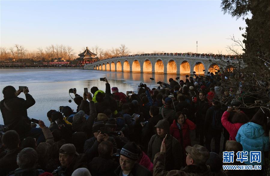 12月23日,游客和攝影愛好者在拍攝頤和園十七孔橋“金光穿洞”美景。 當日,北京頤和園十七孔橋出現(xiàn)“金光穿洞”美景,吸引許多游客和攝影愛好者前來觀賞拍攝。 新華社記者陳曄華攝