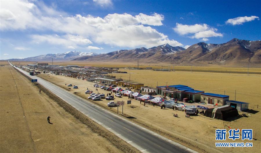這是在青藏公路旁搭建的那曲縣香茂鄉(xiāng)畜產(chǎn)品展銷(xiāo)會(huì)(2017年11月25日無(wú)人機(jī)拍攝)。 新華社記者 劉東君 攝