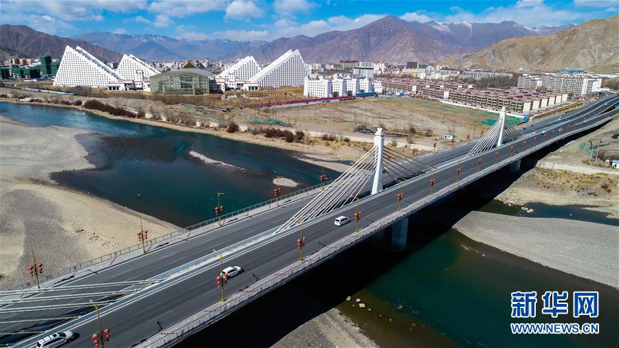 這是橫跨拉薩河的新建環(huán)城路納金大橋段(3月4日無(wú)人機(jī)拍攝)。 新華社記者 晉美多吉 攝