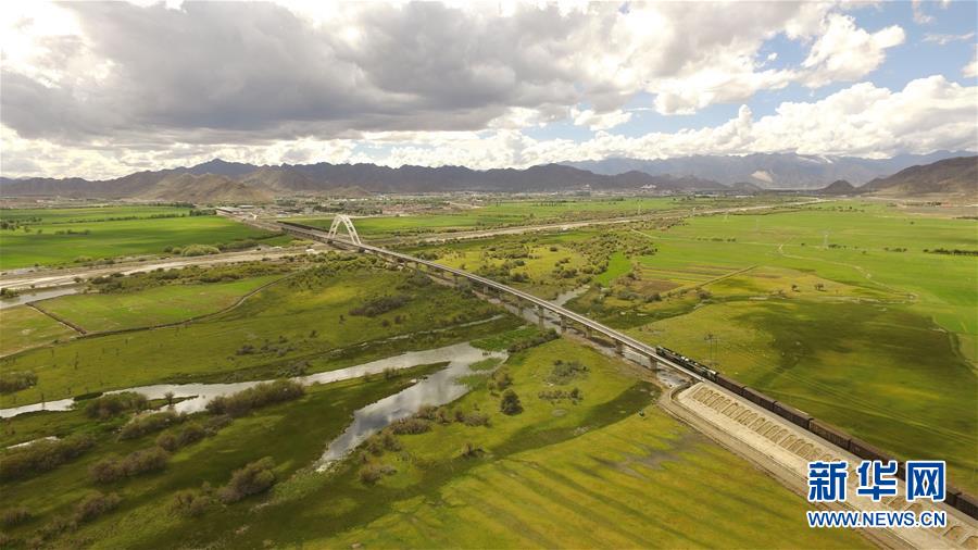 列車(chē)在青藏鐵路延長(zhǎng)線拉日鐵路上行駛(2016年6月17日無(wú)人機(jī)拍攝)。 新華社記者 劉東君 攝