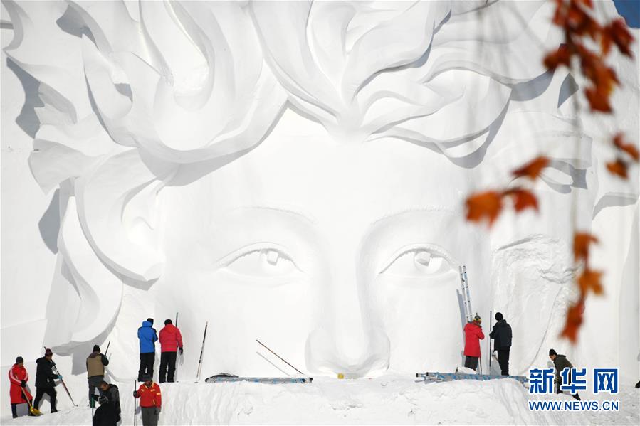 12月24日,雪雕師在制作太陽島雪博會主塑“星河之旅”。 當(dāng)日,哈爾濱太陽島雪博會主塑露出“芳容”。本屆雪博會主塑“星河之旅”長106米,高32米,寬20米,用雪量達(dá)4萬立方米。 新華社記者 王建威 攝