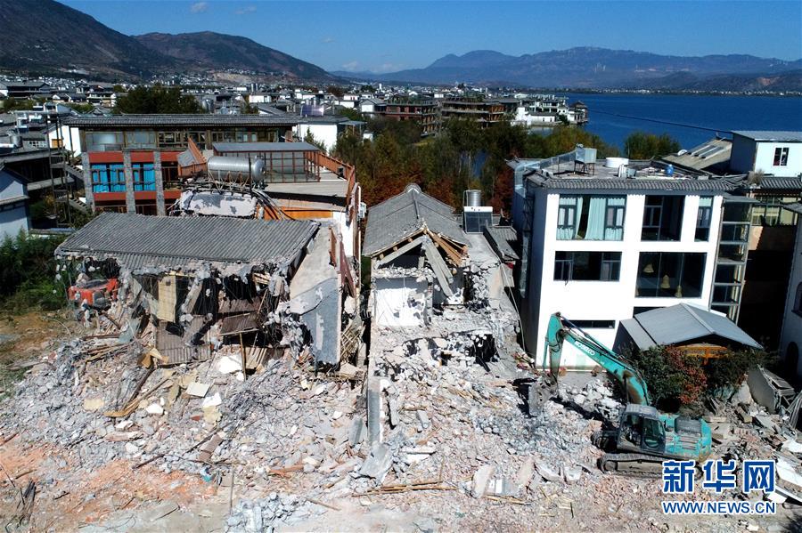 為實(shí)施“三線”劃定,喜洲鎮(zhèn)兩家民宿被拆除(11月15日無(wú)人機(jī)拍攝)。
