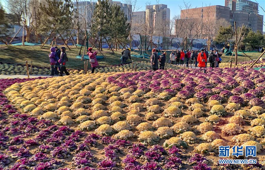 12月24日,游人在北京玉淵潭公園觀賞甘藍(lán)。 日前,北京市玉淵潭公園移栽的三萬(wàn)多棵紫色和黃色羽衣甘藍(lán)盛開,為冬季公園增添了色彩。 新華社記者李欣攝