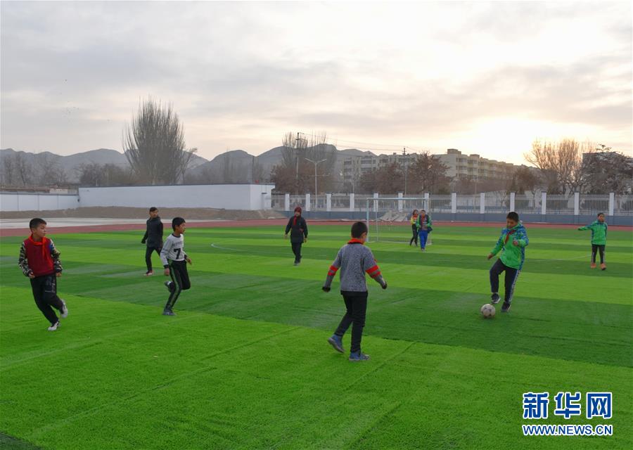烏什·衢州小學(xué)學(xué)生在操場(chǎng)上踢球(12月19日攝)。