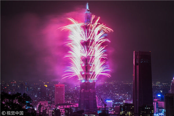 2018年1月1日,臺(tái)北101大樓燃放焰火迎接新年的到來。
