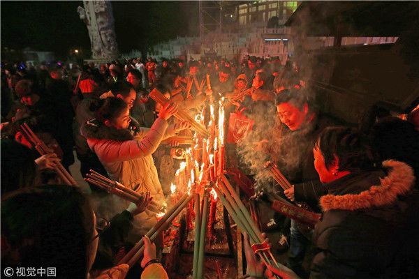 2018年12月31日晚,市民在江蘇常州天寧寶塔廣場(chǎng)燒香祈福。