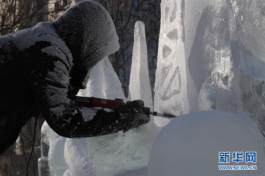 12月27日,來自東北石油大學(xué)的選手在比賽中完善冰雕作品。 當(dāng)日,第十六屆黑龍江省大學(xué)生冰雕藝術(shù)設(shè)計創(chuàng)作大賽在哈爾濱兆麟公園落下帷幕,全省高校共有99支隊伍參賽。 新華社記者曹霽陽攝