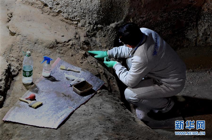 在河南鄭州大河村遺址博物館,科研人員在對仰韶文化房基進(jìn)行體檢、加固(12月11日攝)。