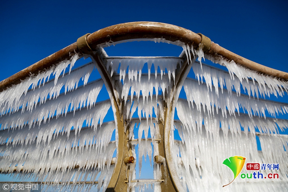 2018年12月29日,大連市迎來入冬以來最冷-12℃的低溫,在大風和潮汐的作用下,海水在岸邊的護欄上瞬間凝固,凝結并形成大面積形狀各異的冰凌,在延綿5公里的木棧道上形成奇特的冰凌奇觀。