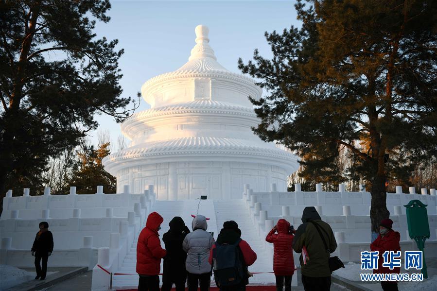 12月29日,在太陽島雪博會(huì)園區(qū),游客在雪雕作品前拍照。 當(dāng)日,第31屆哈爾濱太陽島國(guó)際雪雕藝術(shù)博覽會(huì)正式開園。本屆太陽島雪博會(huì)以“歡樂雪博會(huì)·夢(mèng)幻雪域游”為主題,占地90萬平方米,分為五大景區(qū)。 新華社記者 王建威 攝