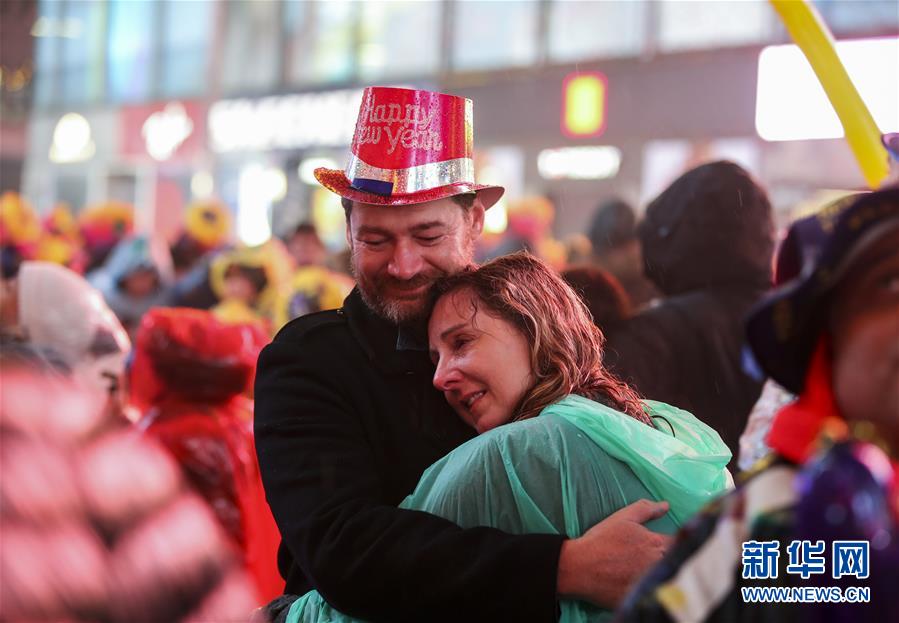 1月1日,在美國紐約時報廣場,一對情侶在新年鐘聲敲響后擁抱。 新華社記者王迎攝