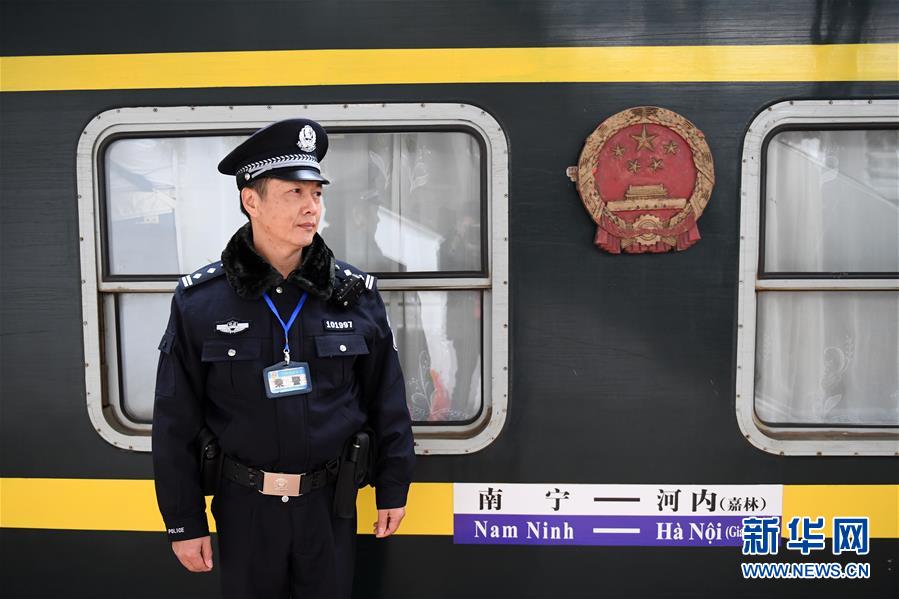 1月1日,在廣西南寧火車站,楊鐵鳴在剛剛從越南河內(nèi)(嘉林)開來的列車旁值勤。楊鐵鳴是第一趟中越國際客運列車的當班乘警,現(xiàn)在依然在這趟列車上值守。 新華社記者陸波岸攝