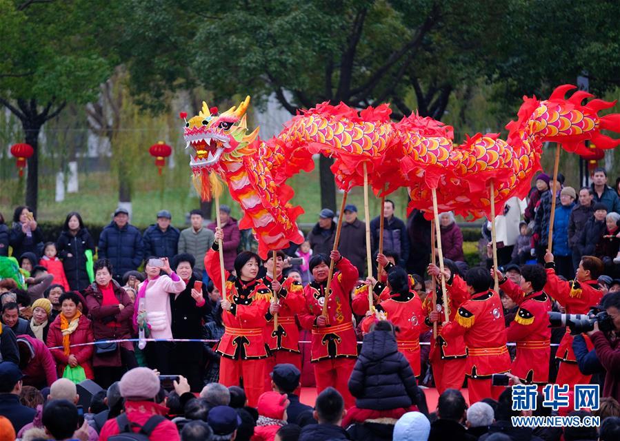 2019年1月1日,演員在展演活動上進行舞龍表演。2019年元旦,浙江省桐鄉(xiāng)市濮院鎮(zhèn)舉辦新年“非遺文化藝術(shù)節(jié)”活動,濮院鎮(zhèn)下屬多個鄉(xiāng)村的傳統(tǒng)美食制作、手工藝品、非遺文化表演等鄉(xiāng)村特色非遺項目在濮院鎮(zhèn)中心廣場進行集中展示展演。新華社記者 徐昱 攝