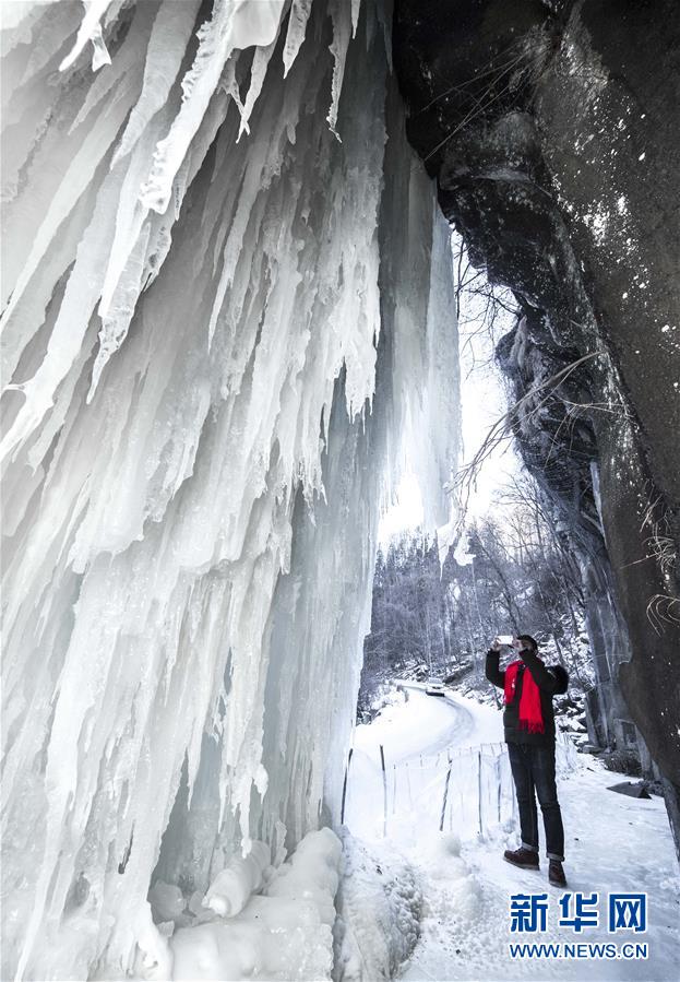 游人在吉林省長白縣十五道溝望天鵝景區(qū)內(nèi)拍攝冰瀑景觀(1月3日攝)。新華社記者許暢攝