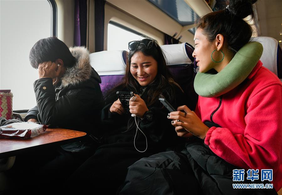 大學(xué)生剛措(右)和桑旦措姆(中)放寒假乘坐Z6802次列車回老家那曲(1月11日攝)。