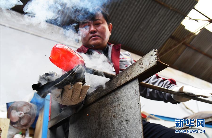 1月12日,孫云毅在吹制雞油黃琉璃藝術(shù)品。