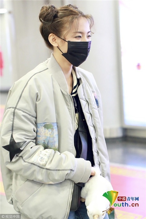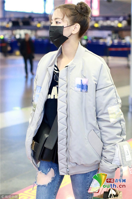 2019年1月14日,北京,楊超越現(xiàn)身機場。她扎哪吒頭活力十足,甩玩偶淘氣回眸,穿破洞褲露美腿,披面包服似自帶鼓風(fēng)機。