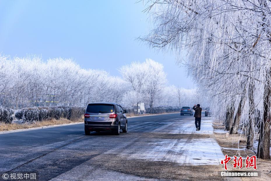1月13日,107國道河北省定州路段出現(xiàn)霧凇(樹掛)景觀,吸引路人駐足拍照留念。王保生 攝 圖片來源:視覺中國
