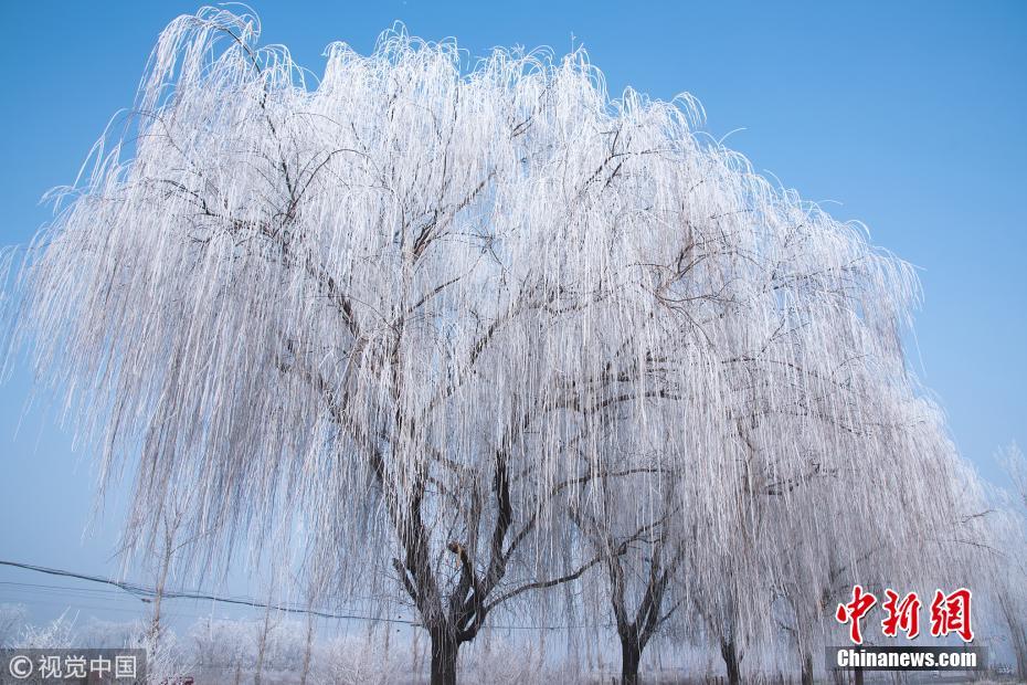 1月13日,107國(guó)道河北省定州路段出現(xiàn)霧凇(樹(shù)掛)景觀,吸引路人駐足拍照留念。王保生 攝 圖片來(lái)源:視覺(jué)中國(guó)