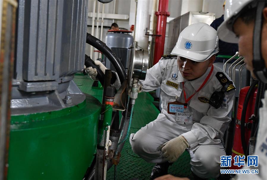 1月15日,??诤J戮止ぷ魅藛T在粵海鐵4號客滾船的機艙內(nèi)進行檢查。新華社記者 楊冠宇 攝