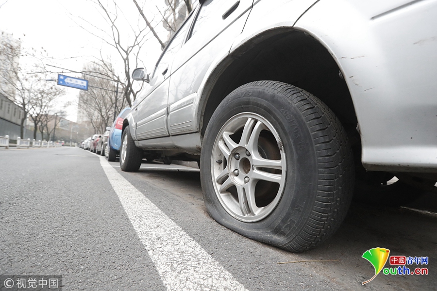 因為是免費停車位,就成為僵尸車的天堂。粗粗數(shù)了一遍,至少有10余輛汽車裹著車衣,被落葉等臟物覆蓋;有的車最后的年檢標志是3年前,車胎漏氣,車內(nèi)也是堆著雜物。