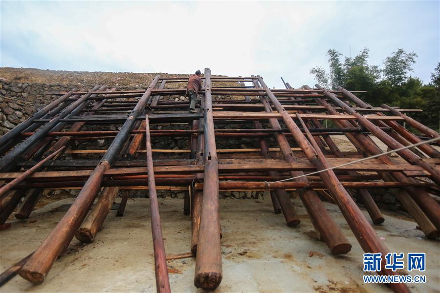 1月15日,在廣西融水苗族自治縣融水鎮(zhèn)夢嗚苗寨,工人在吊腳樓的主要結(jié)構(gòu)上施工,準備起樓。新華社記者 陳君清 攝