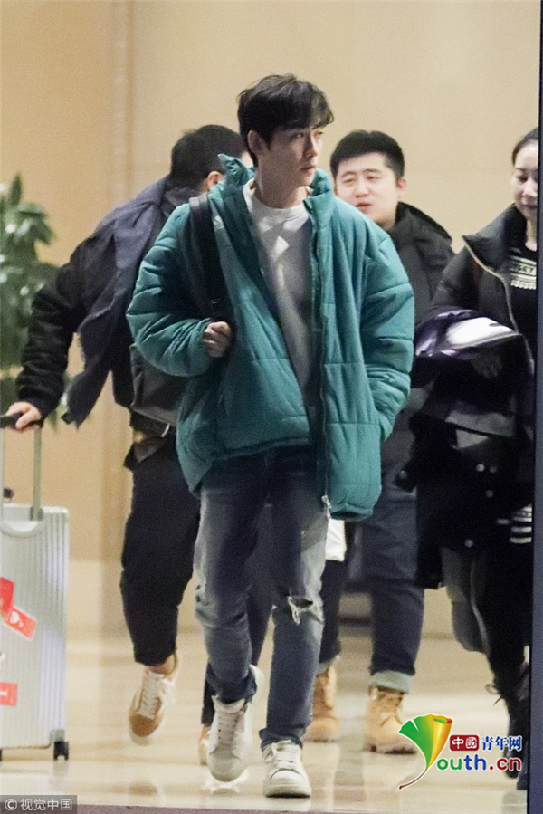 1月15日,北京,朱一龍現身機場。他穿綠色棉襖一路插兜保暖,搭配破洞褲潮范兒十足長腿搶鏡,打扮簡單毫無男神包袱,看鏡頭還一臉呆萌,但氣質仍然出眾。