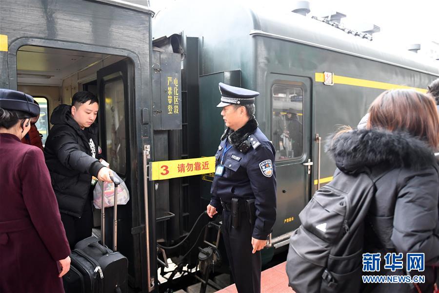 1月1日,在廣西南寧火車站,乘警楊鐵鳴在從越南河內(nèi)(嘉林)開(kāi)往中國(guó)南寧列車旁值勤。 新華社記者陸波岸攝