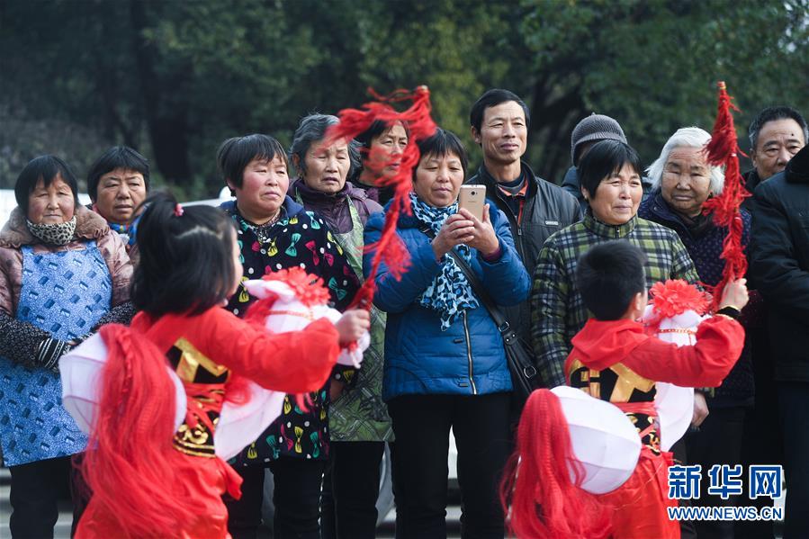 1月16日,新塘村村民觀看傳統(tǒng)非遺項目——下箬馬燈。下箬馬燈是發(fā)源于長興縣的民間舞蹈,距今已有1000多年歷史。 臨近春節(jié),浙江省長興縣開發(fā)區(qū)中心幼兒園的老師和孩子們來到長興縣太湖街道下屬的新塘村,為村民表演文藝節(jié)目,用喜慶的傳統(tǒng)舞蹈營造節(jié)日氣氛。另外孩子們還用紙盒、瓶子、彩色包裝紙等廢舊物品制作了環(huán)保花燈,送給村民,倡導(dǎo)低碳環(huán)保的節(jié)日新風(fēng)。 新華社記者 徐昱 攝