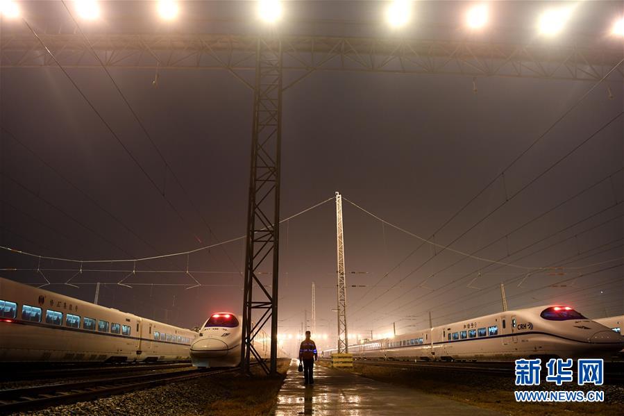 1月29日,王瑞在合肥南動車運用所存車場走向下一輛動車。新華社記者劉軍喜攝