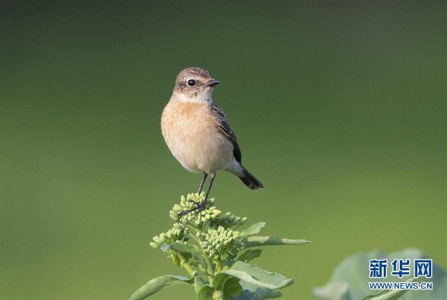 一只小鳥在油菜花枝頭上停歇(2月15日攝)。 新華社記者梅永存攝