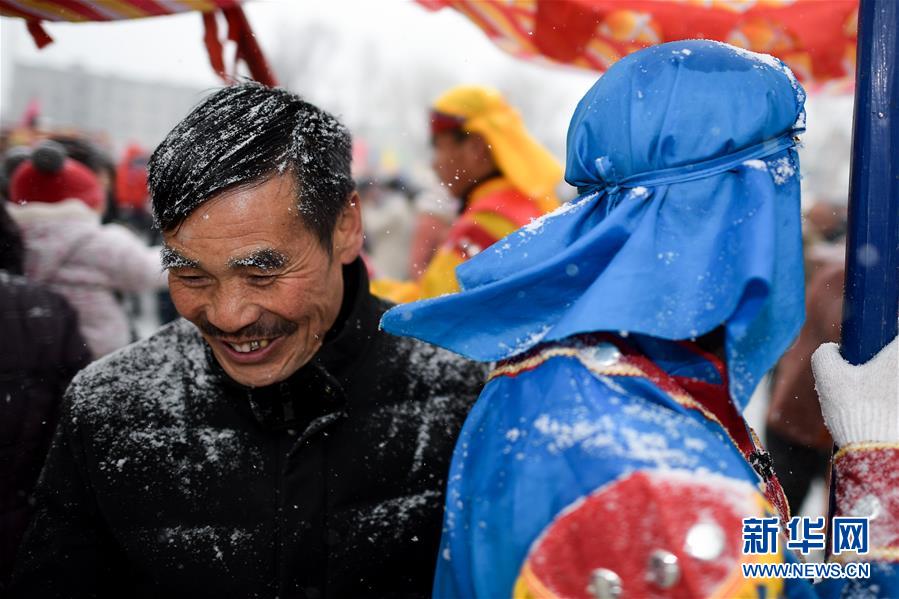2月16日,青海省大通回族土族自治縣文化廣場(chǎng),當(dāng)?shù)匕傩赵谏缁鸨硌葜小般@龍身”。新華社記者吳剛攝