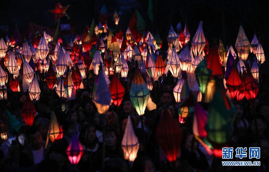 2月18日,群眾在四川省南充市嘉陵區(qū)金寶鎮(zhèn)點(diǎn)亮“蠐蟆燈”。 當(dāng)日是農(nóng)歷正月十四,夜幕降臨后,川渝等地數(shù)萬名群眾在四川省南充市嘉陵區(qū)金寶鎮(zhèn)匯聚,點(diǎn)亮“蠐蟆燈”,敲著鑼鼓唱著歌謠,將“蠐蟆”送到幾公里外的田邊或者河邊燒掉,祈福健康平安。星星點(diǎn)點(diǎn)的燈光在鄉(xiāng)間小路閃爍移動,場面壯觀熱烈。 “送蠐蟆”祈福這一習(xí)俗源于清朝,歷經(jīng)演變成為川東北地區(qū)一個古老而神秘的地方民俗節(jié)日。 新華社記者 江宏景 攝