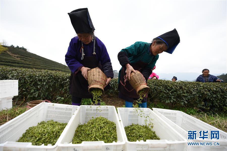 3月17日,采茶工在丹寨縣龍泉鎮(zhèn)馬寨村的茶園里采摘春茶。新華社記者 楊文斌 攝