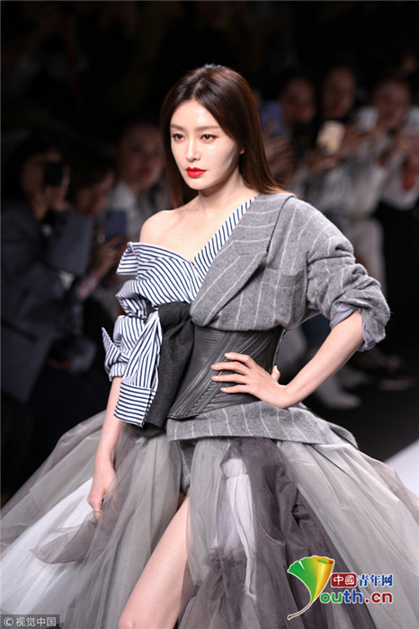 2019年3月31日,上海,2019上海秋冬時(shí)裝周,秦嵐助陣古巨基自創(chuàng)品牌大秀。她穿西裝紗紗裙笑容滿面可鹽可甜,斜肩小西裝正好能露出天鵝頸的線條,性感又不失知性?!拔灏⒏纭惫啪藁鶆t穿著隨性,與“知畫”牽手走秀,引起滿滿“回憶殺”。