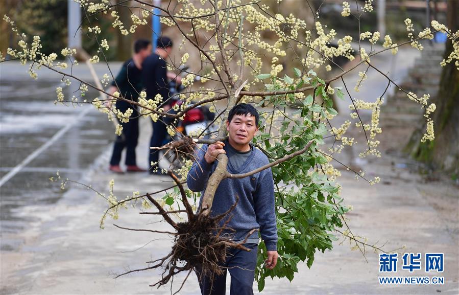 這是黔桂烏英苗寨的群眾在抬樹(shù)苗,準(zhǔn)備用來(lái)美化居住環(huán)境(3月16日攝)。