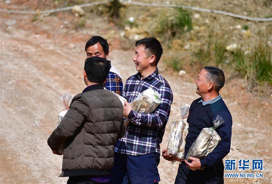 在廣西融水苗族自治縣桿洞鄉(xiāng)堯告村,貧困戶(hù)韋玉元在苗坪嶺藥材種植專(zhuān)業(yè)合作社里領(lǐng)取靈芝菌棒(3月11日攝)。